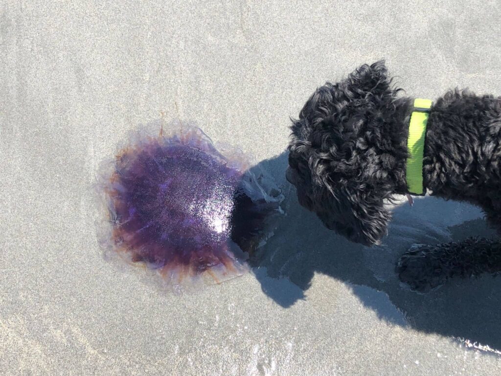 I sniff the jellyfish curiously, trying to understand what it is. I bark at it, tryindg to get its attention. Maybe it wants to play with me? But my owners tell me it’s a jellyfish and that I should be careful not to touch it because it can sting me. I back away, a little scared, but I can’t help but keep my eye on the strange creature.